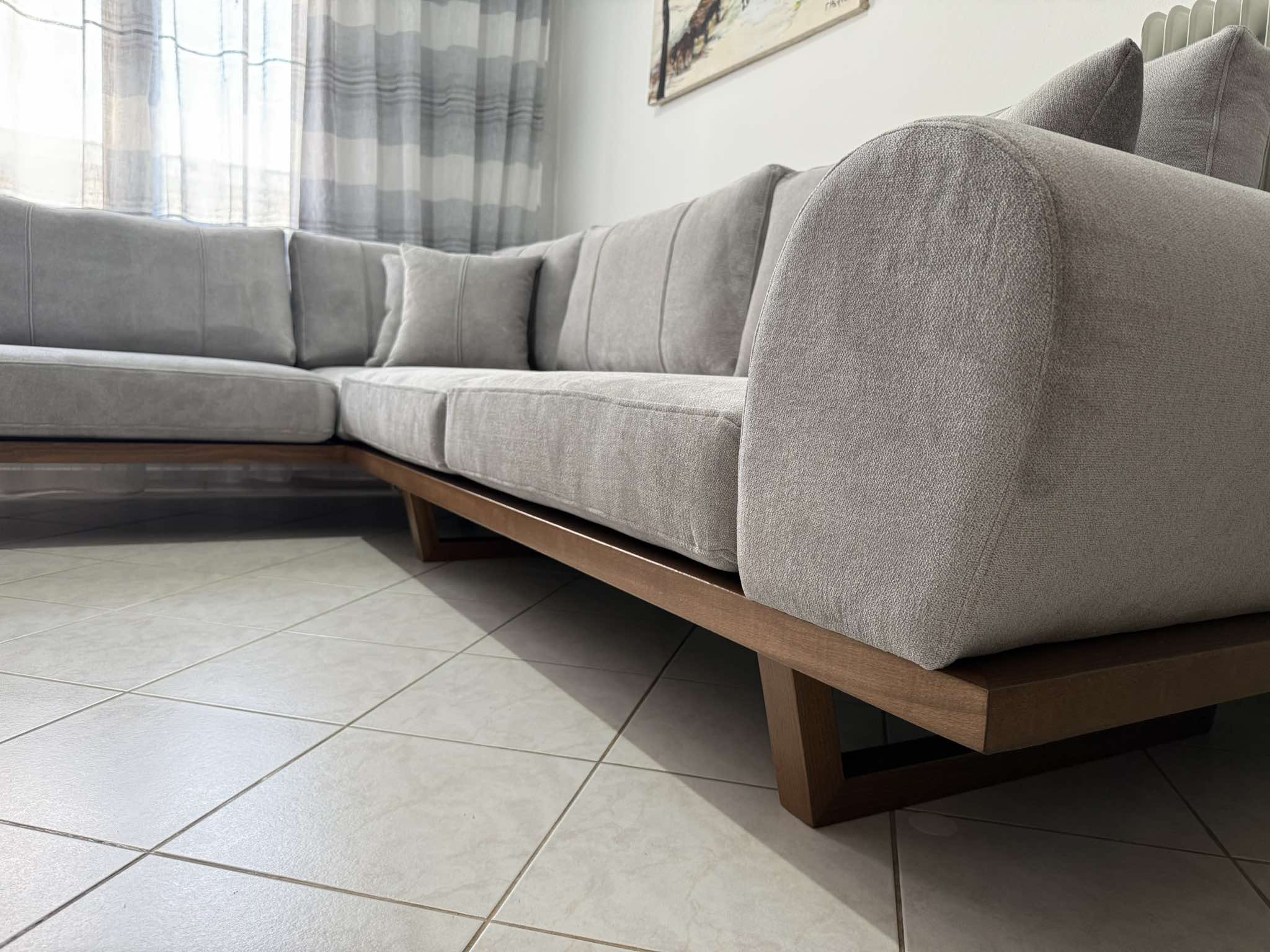 Γωνιακός καναπές Βιέννη με αδιάβροχο αλέκιαστο ύφασμα. Η ξύλινη μπάζα σε συνδυασμό με τα γαζιά στα μαξιλάρια πλάτης είναι αυτό που το κάνει να ξεχωρίζει.