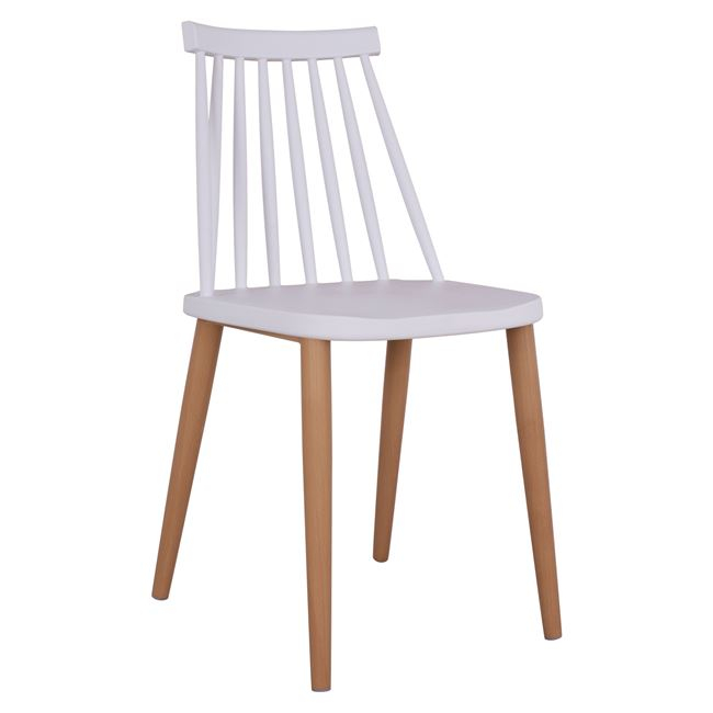 Μοντέρνα καρέκλα τραπεζαρίας με κάθισμα από πολυπροπυλένιο και πόδια μεταλλικά με απόδοση στο φυσικό χρώμα του ξύλου.