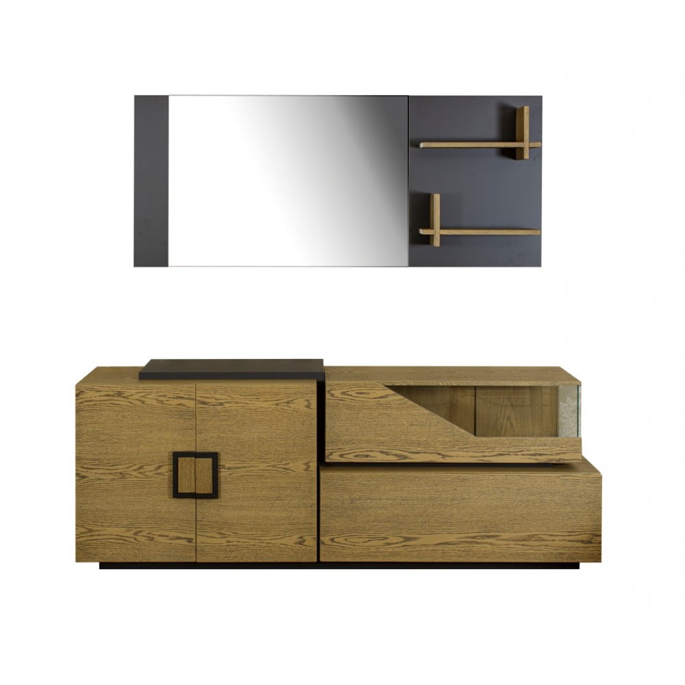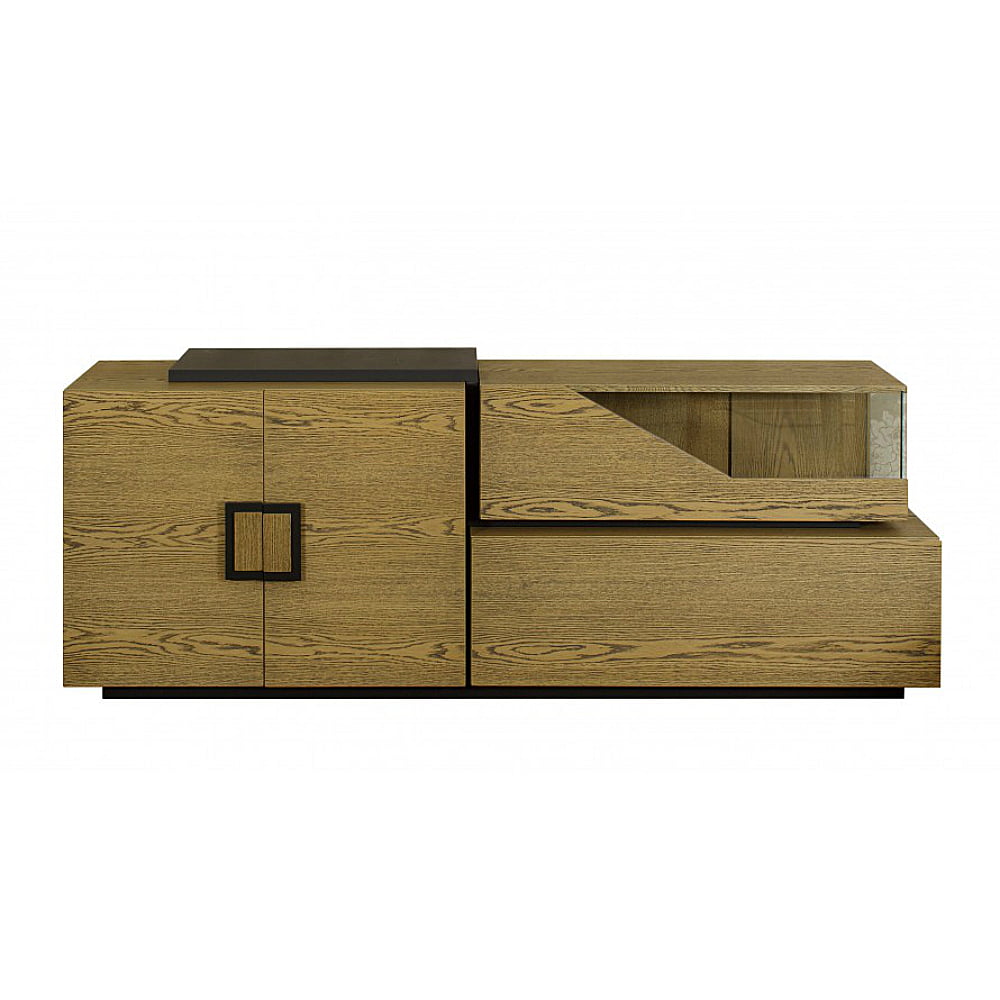 Μπουφές άνετου αποθηκευτικού χώρου, σε φυσικό καπλαμά δρυός και λεπτομέρειες λάκας, με διακριτικό φωτιζόμενο βιτρινάκι.