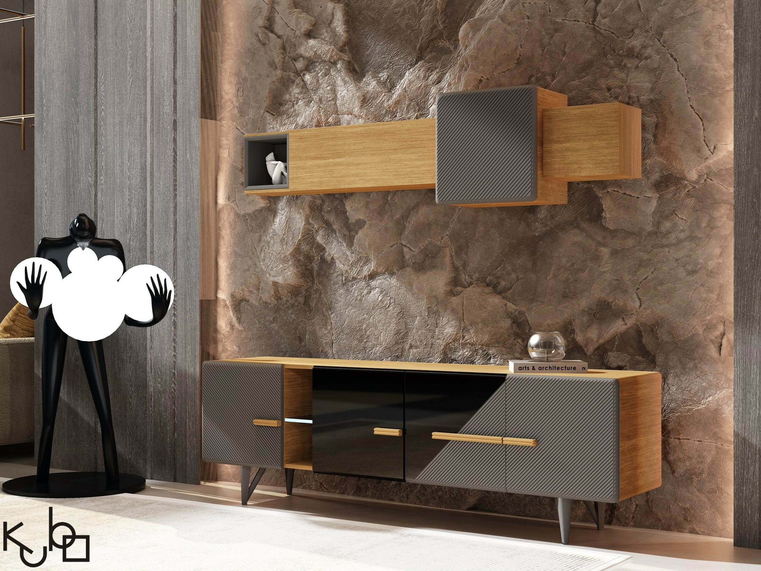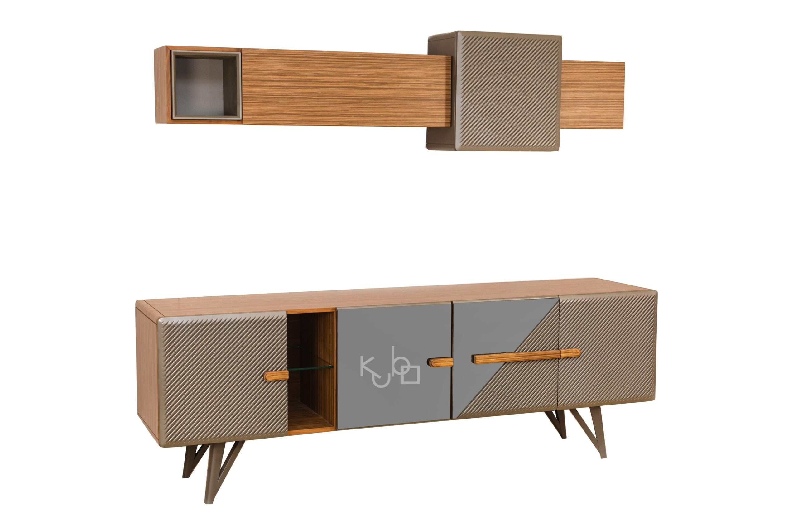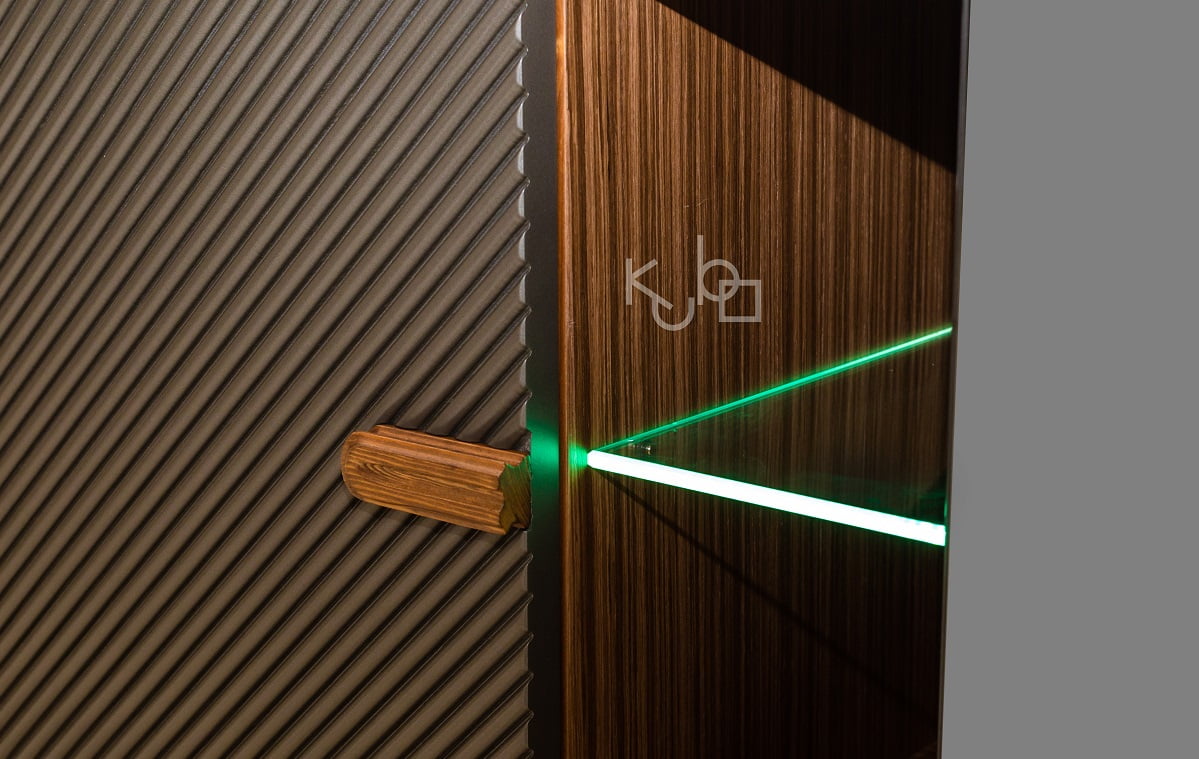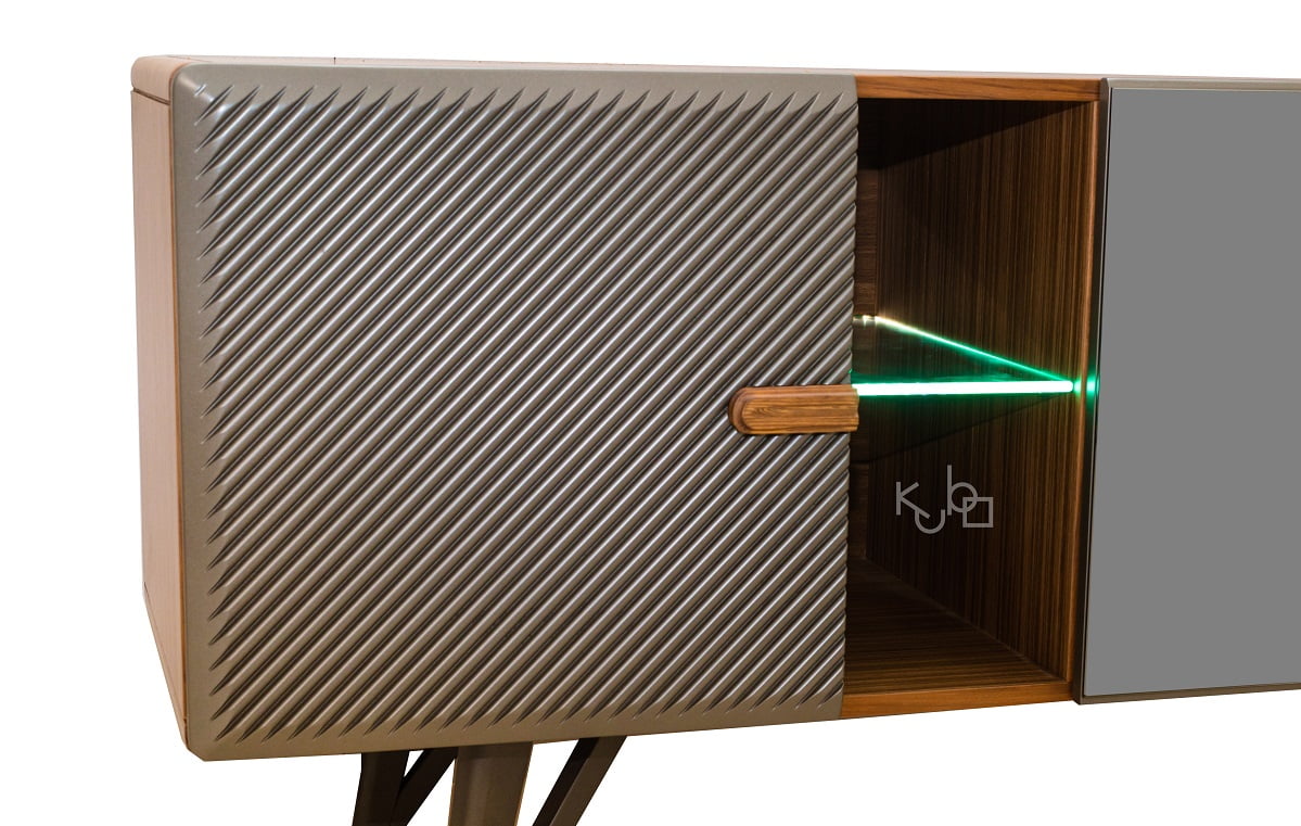 Μπουφές καρυδιάς με λακαριστά πορτάκια που σχηματίζουν ραβδώσεις, λεπτομέρειες καθρέπτη φιμέ και κρυφό φωτισμό.