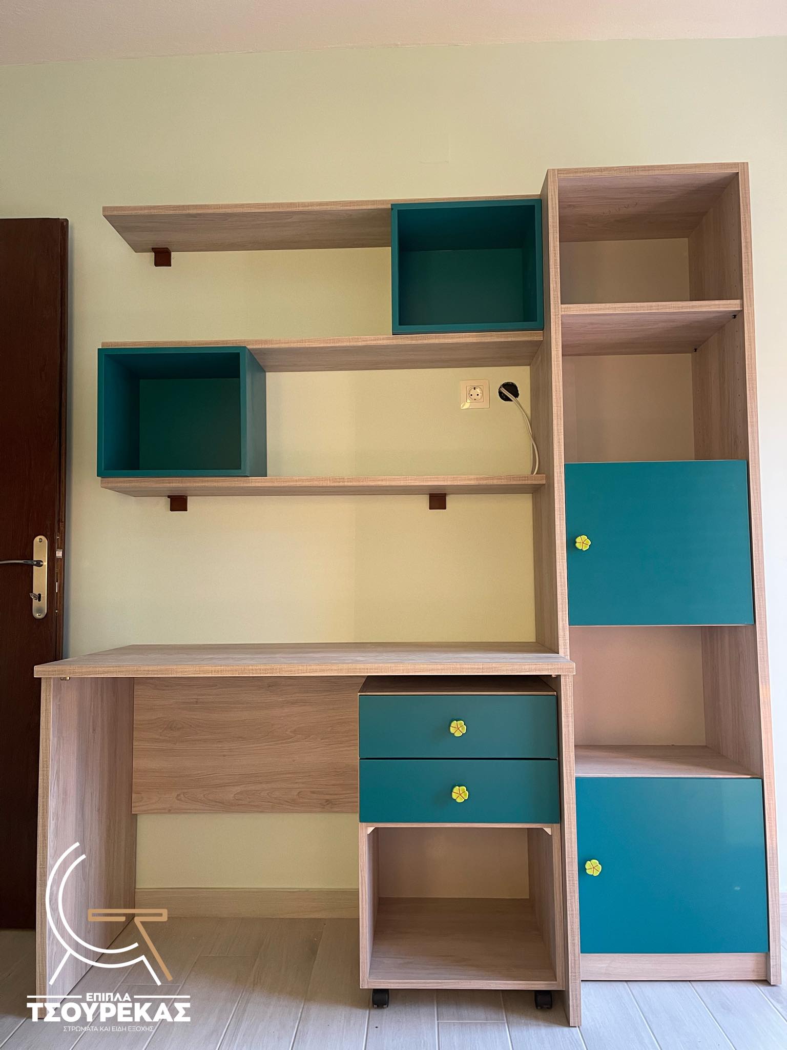 Παιδικό γραφείο με στήλη και κρεμαστή βιβλιοθήκη για αποθήκευση πραγμάτων.