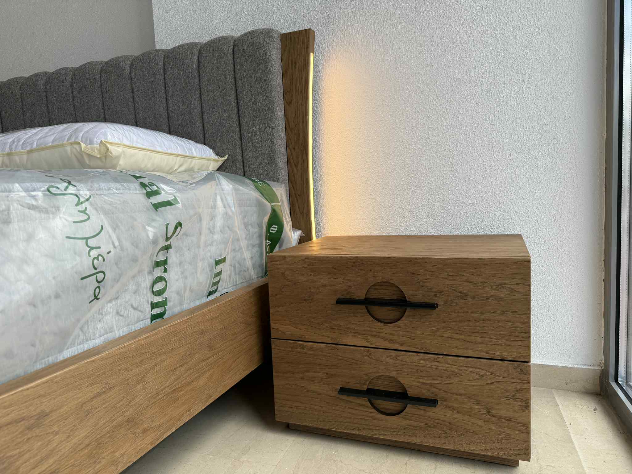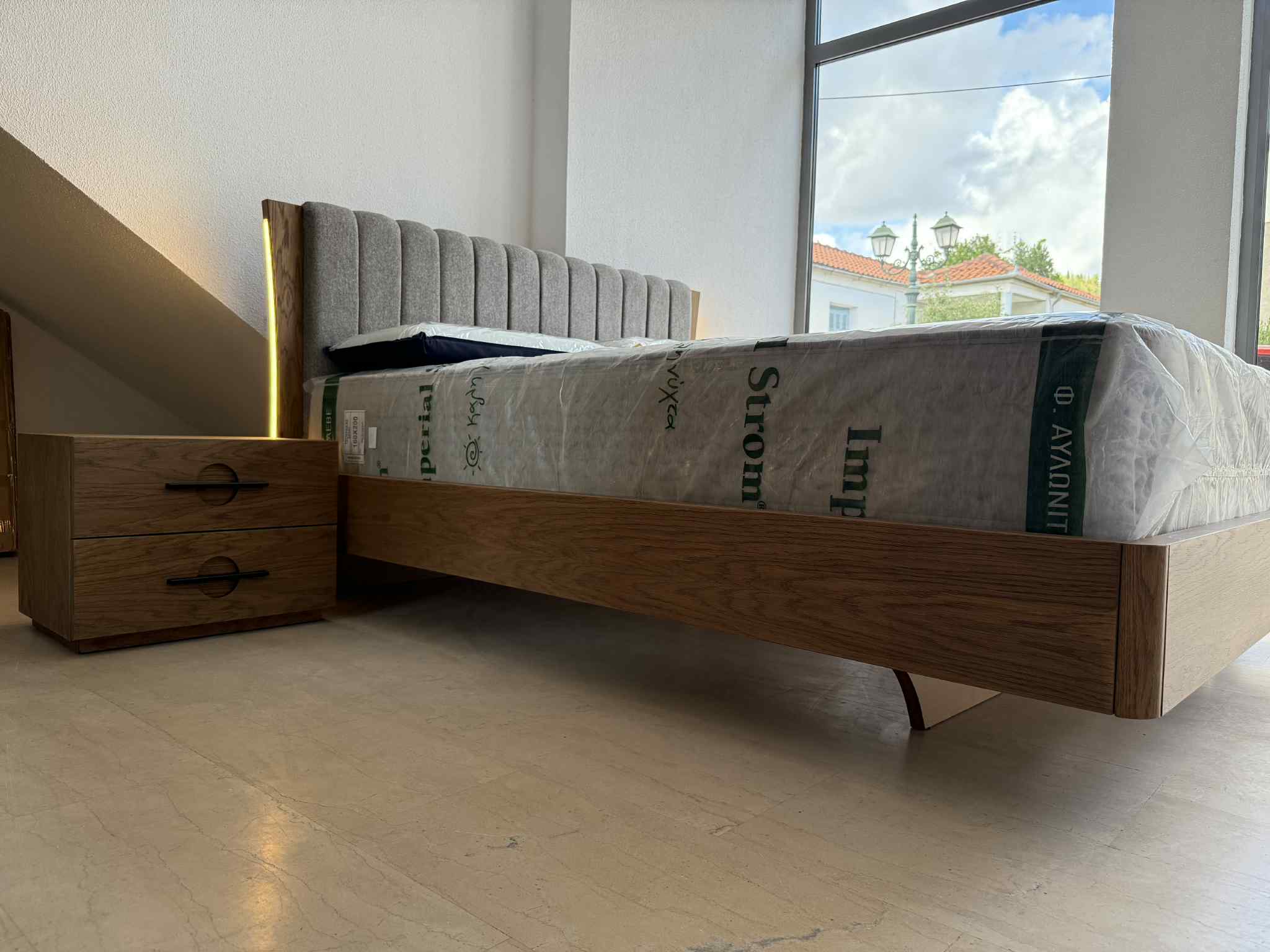 Κρεβατοκάμαρα σε φυσικό καπλαμά δρυός , μοναδικό design με ύφασμα αδιάβροχο και αλέκιαστο στο κεφαλάρι και κρυφό φωτισμό.