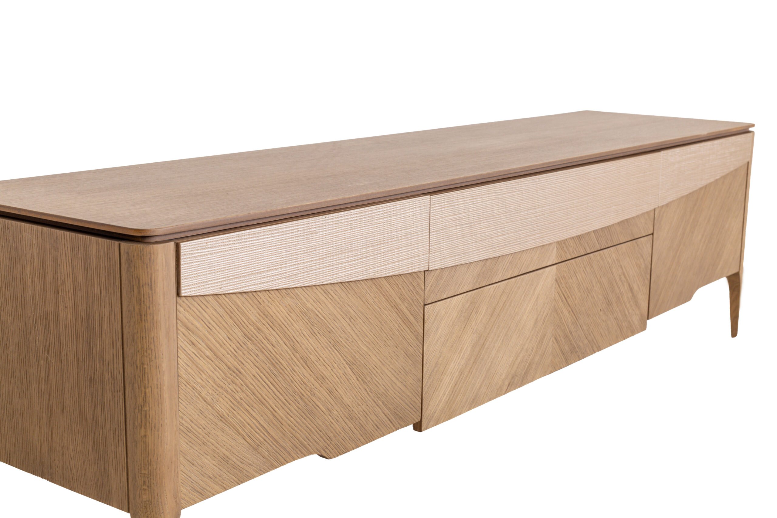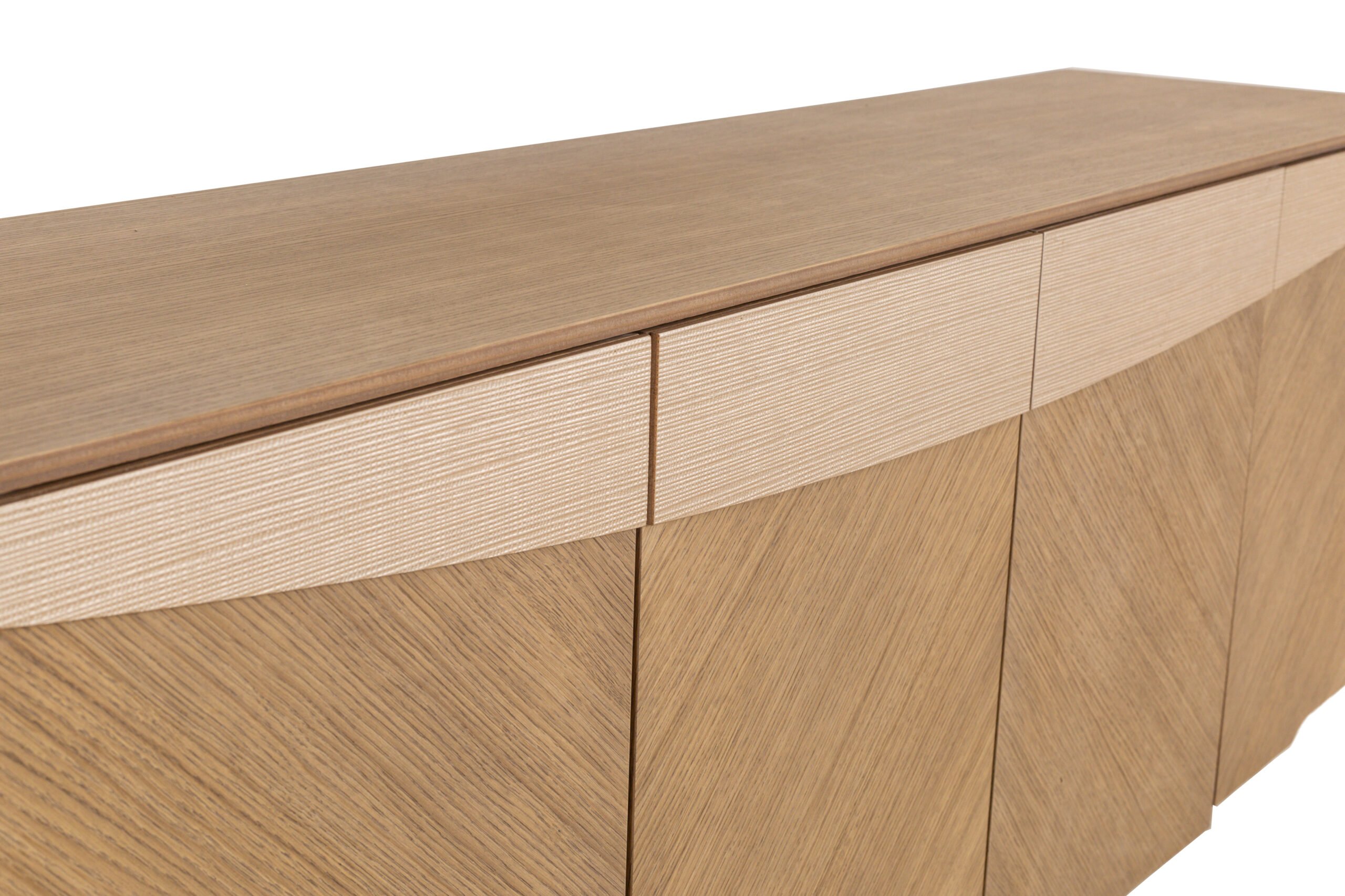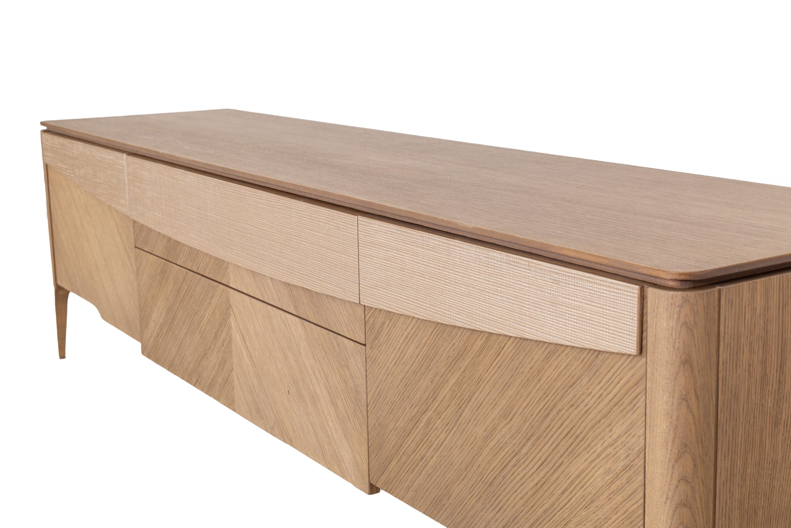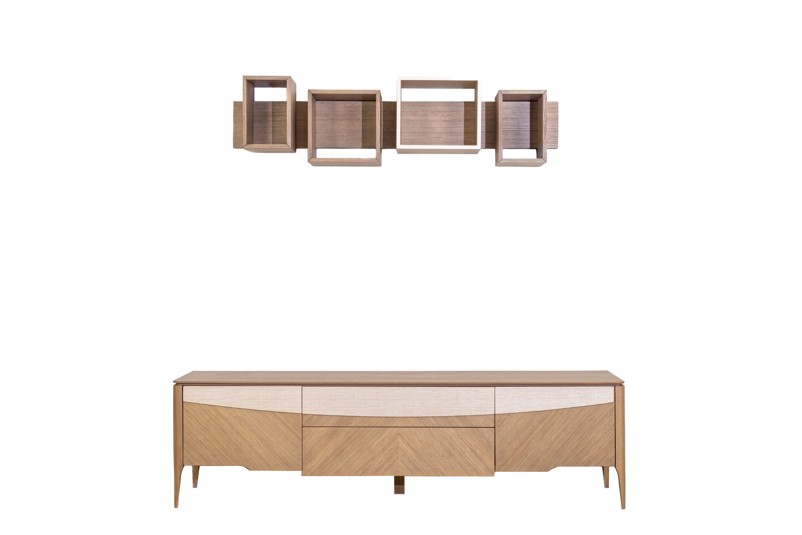 Λιτή σύνθεση με ιδιαίτερη τεχνοτροπία φάλτσου καπλαμά, ψάθινη μπεζ λεπτομέρεια στην πρόσοψη και διακριτικά κρεμαστά κουτιά διακόσμησης. Η βάση διαθέτει πλούσιο αποθηκευτικό χώρο με δύο συρτάρια και δύο ντουλάπια.