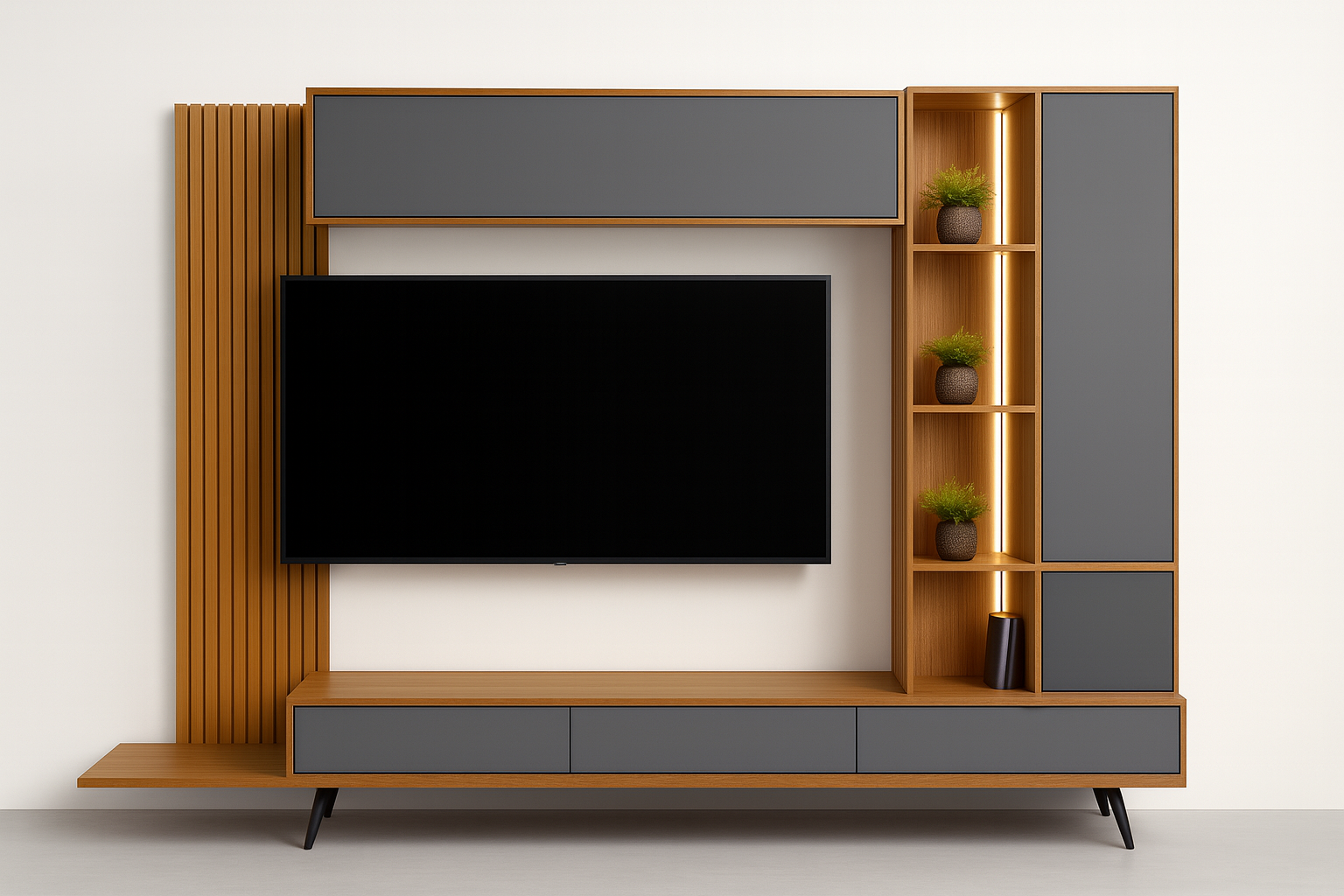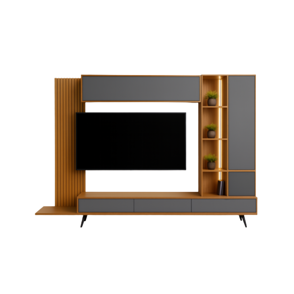 Η αρμονική εναλλαγή φυσικού ξύλου και μαρμάρινης όψης προσφέρει μια αίσθηση πολυτέλειας και διαχρονικότητας, ενώ οι γήινες αποχρώσεις και οι ενσωματωμένες κάθετες γραμμές χαρίζουν μια αίσθηση ζεστασιάς και ηρεμίας. Οι πολλαπλοί αποθηκευτικοί χώροι – ανοιχτά ράφια, ντουλάπια και συρτάρια – εξασφαλίζουν πρακτικότητα και οργάνωση, ιδανικά για να φιλοξενήσουν βιβλία, διακοσμητικά ή multimedia συσκευές.