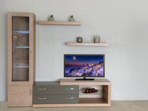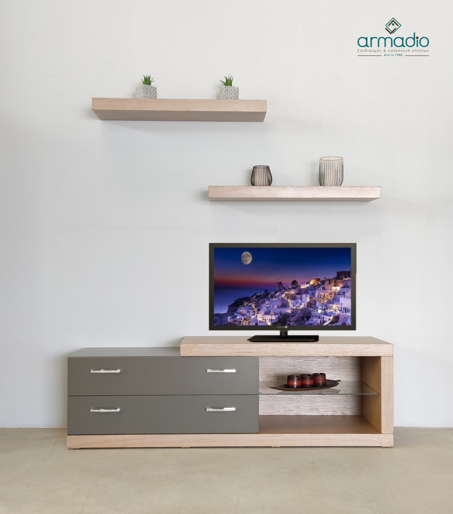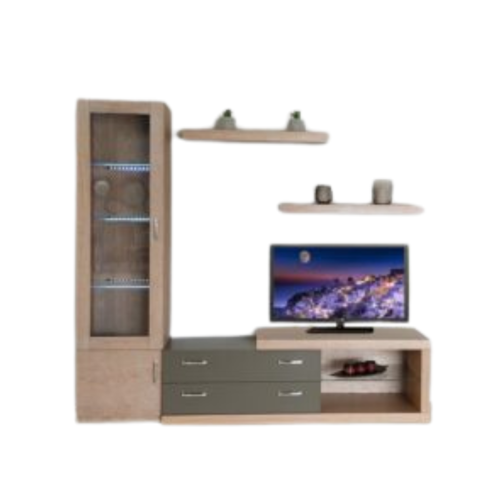 Μοντέρνα σύνθεση εξαιρετικής κατασκευής με λειτουργική γραμμή. Αποτελείται από βιτρίνα με φωτισμό LED, 2 ράφια και 2 συρτάρια ως αποθηκευτικό χώρο. Είναι κατασκευασμένη από ξύλο δρυς με συνδυασμό λάκας.