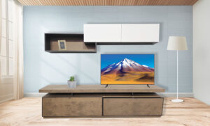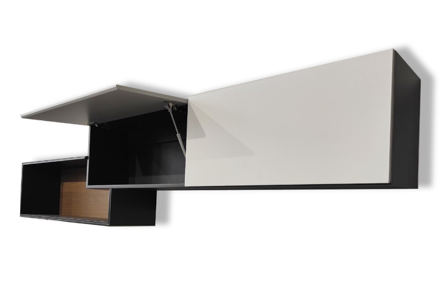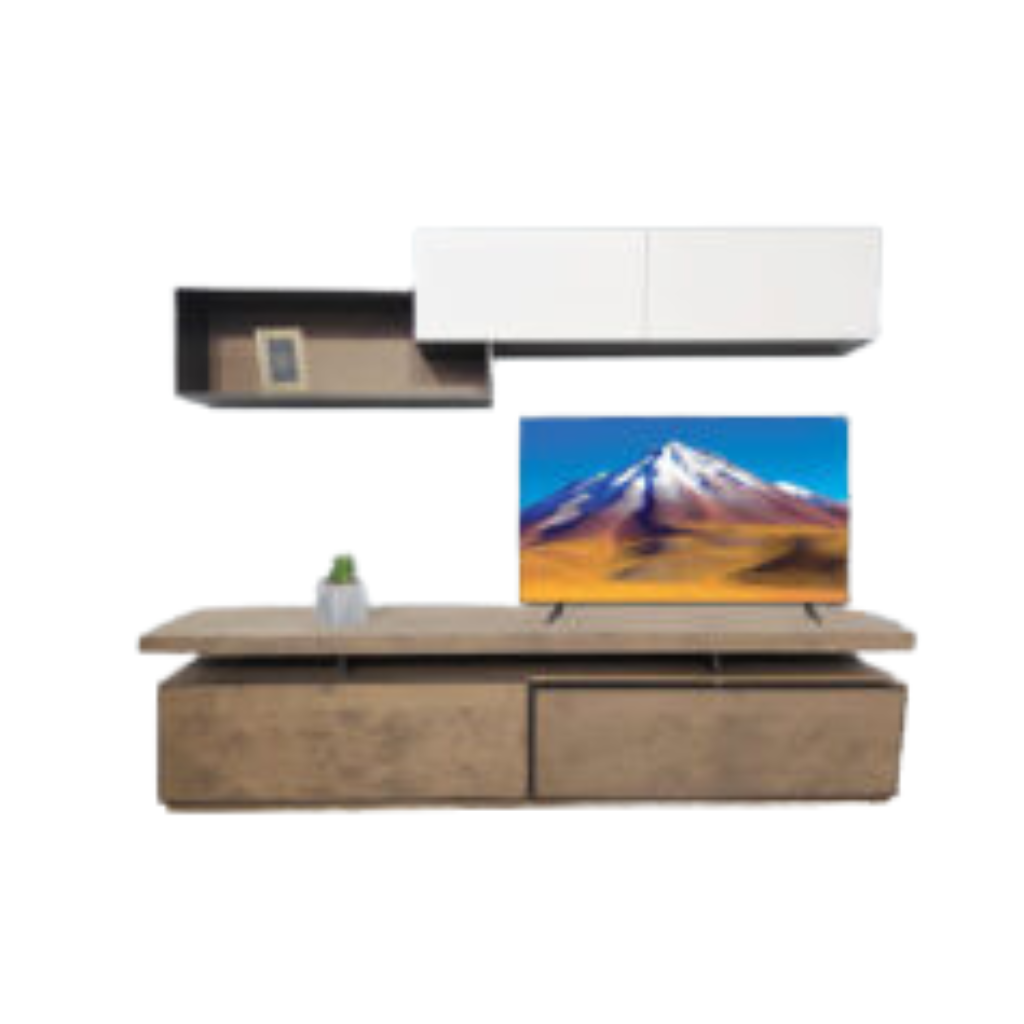 Σύνθεση για σαλόνι κορυφαίας ποιότητας. Κατασκευασμένη από ξύλο δρυς με συνδυασμό λάκας. Διαθέτει φωτισμό LED και ντουλάπια για αποθηκευτικό χώρο, με μηχανισμούς τελευταίας τεχνολογίας.