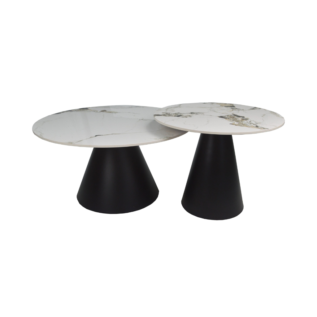 Σετ τραπεζιών Φ80 και Φ60 με κεραμική επιφάνεια και μεταλλική μαύρη βάση.