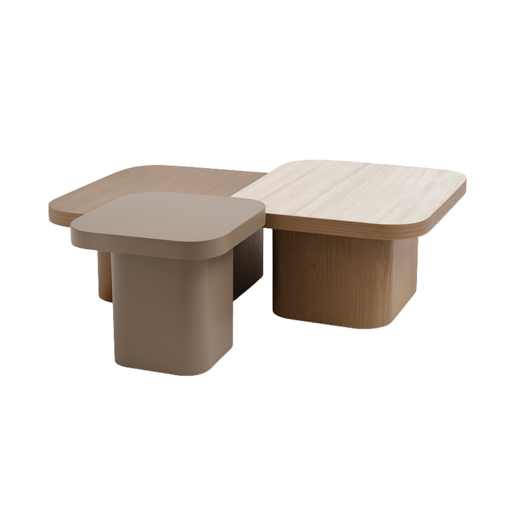 Τα τραπεζάκια Mira είναι ένας δημιουργικός συνδυασμός σχημάτων και υλικών, που δίνουν στο σαλόνι μια αίσθηση δυναμισμού και σύγχρονης πολυτέλειας. Οι στρογγυλεμένες γραμμές και οι διαφορετικές επιφάνειες (ξύλο, λάκα, πέτρα) δημιουργούν ένα εντυπωσιακό αποτέλεσμα.
