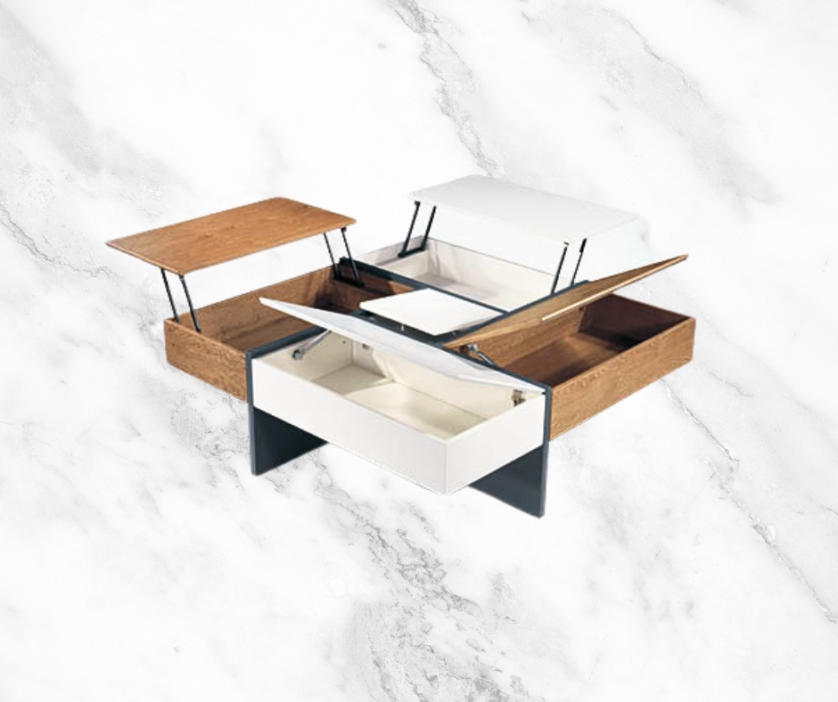 Μοντέρνο πολυμορφικό τραπεζάκι σαλονιού άριστης ποιότητας. Διαθέτει 2 σερβιτόρους για μεγαλύτερη ευκολία στην καθημερινότητα, 1 μπουκαλοθήκη στη μέση και 2 αποθηκευτικούς χώρους. Κατασκευασμένο από ξύλο ρουστίκ με συνδυασμό λάκας.