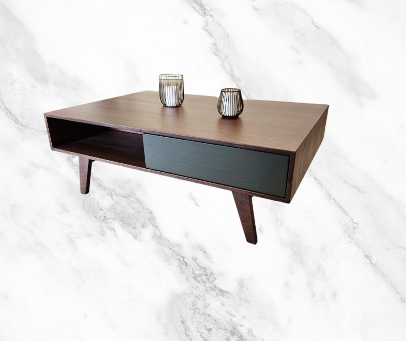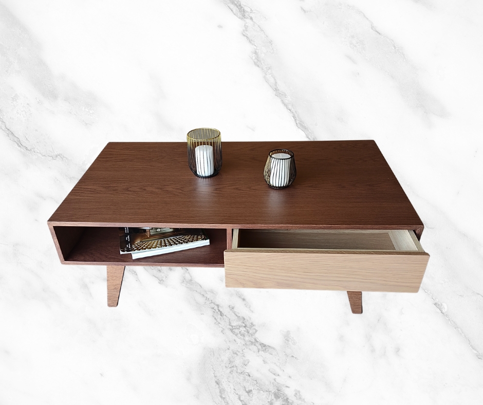 Μοντέρνο τραπεζάκι σαλονιού εξαιρετικής ποιότητας. Διαθέτει 2 συρτάρια με μηχανισμό push για μεγαλύτερη αντοχή στον χρόνο και ανοιχτό αποθηκευτικό χώρο στο πλάι. Κατασκευασμένο από ξύλο δρυς με συνδυασμό λάκας.