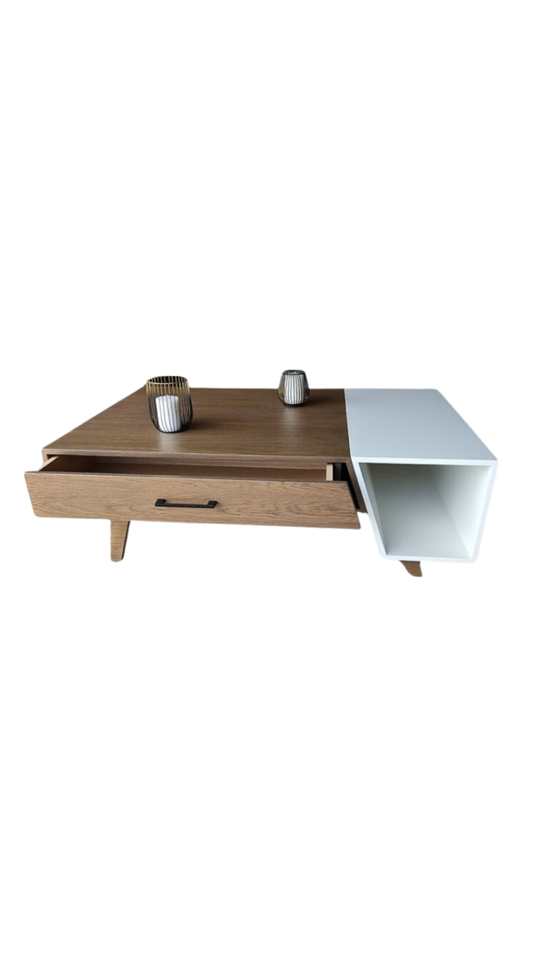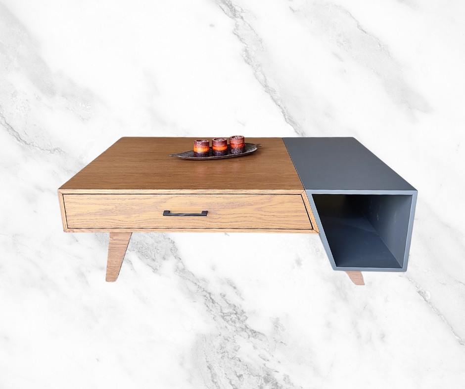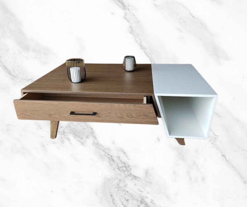 Μοντέρνο τραπεζάκι σαλονιού εξαιρετικής ποιότητας. Διαθέτει 2 συρτάρια και έναν ανοιχτό αποθηκευτικό χώρο. Κατασκευασμένο από ξύλο δρυς με συνδυασμό λάκας.