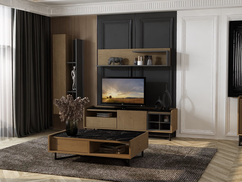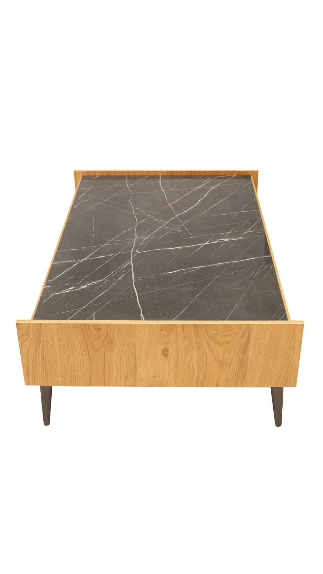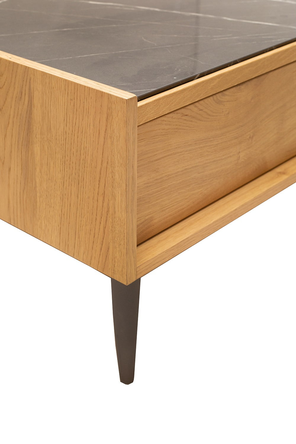 Δρύινο τραπεζάκι σαλονιού μοντέρνου κι εργονομικού χαρακτήρα. Η κεντρική επιφάνειά του αποτελείται από τεχνοτροπία που δίνει την όψη μάρμαρου. Διαθέτει μεγάλα συρτάρια με μηχανισμό push και ψηλά πόδια που δίνουν χαρακτήρα και διευκολύνουν τον καθαρισμό και την αποθήκευση.
