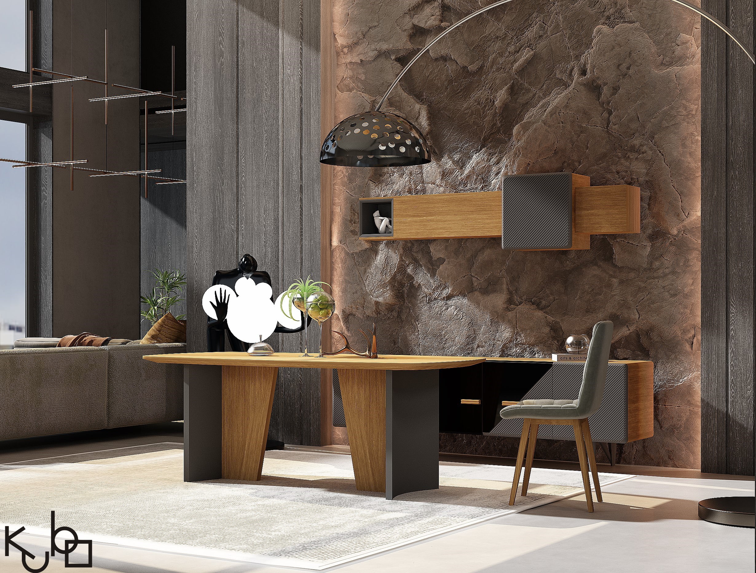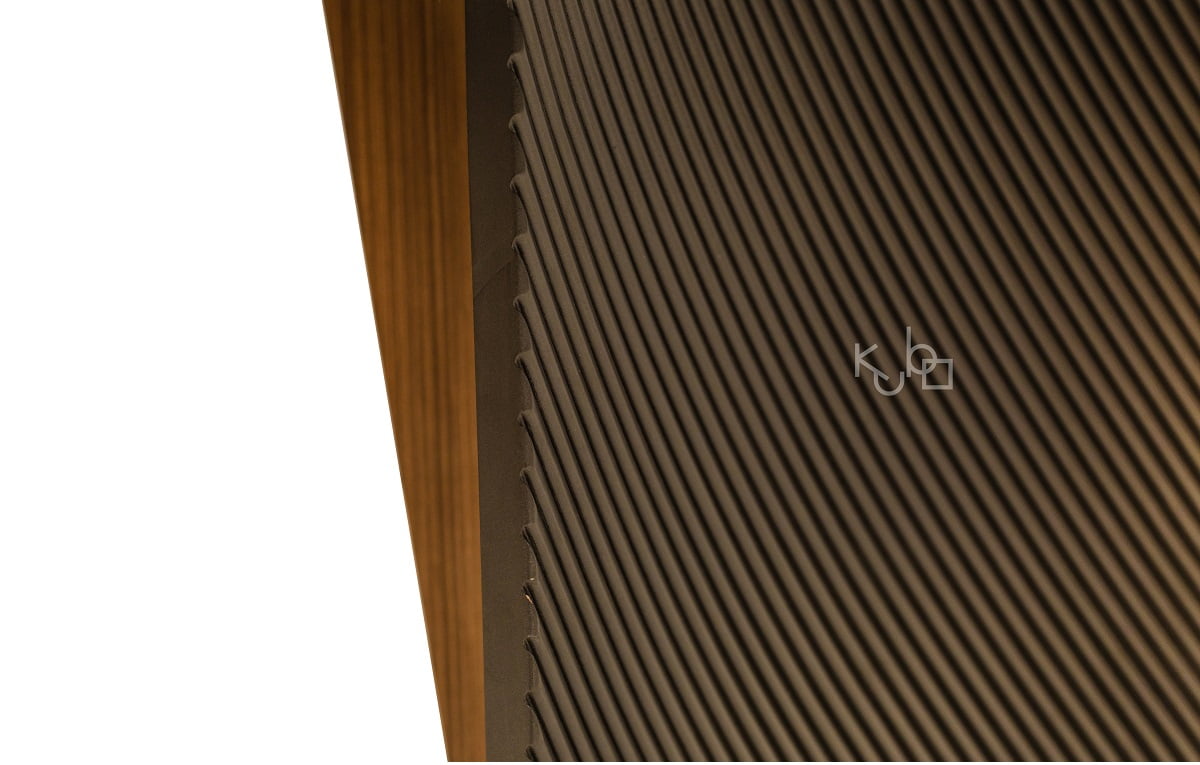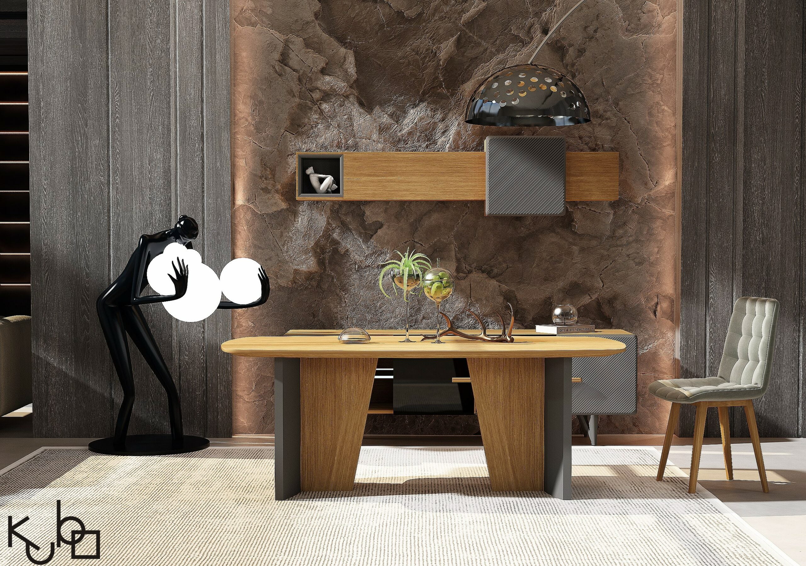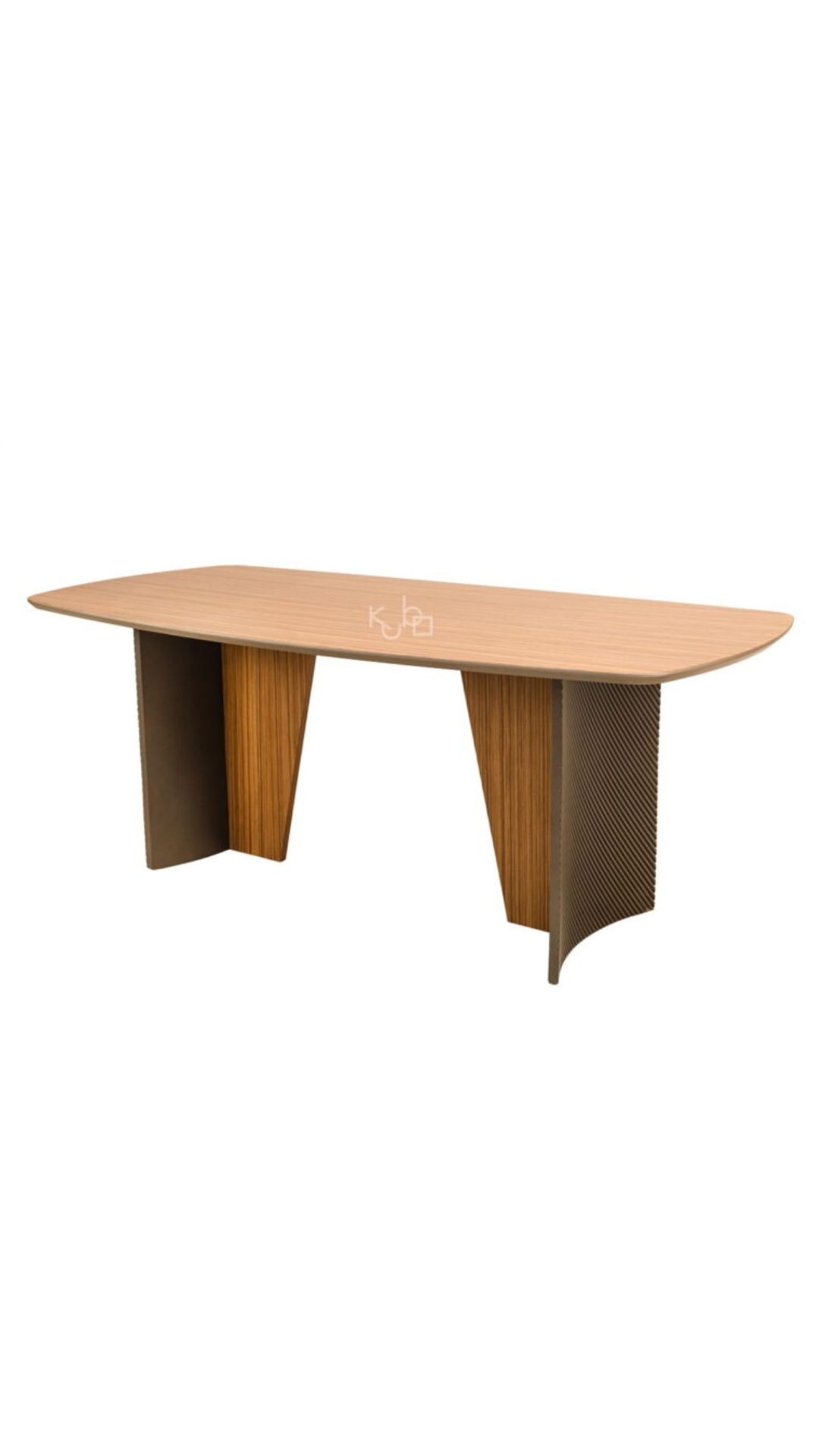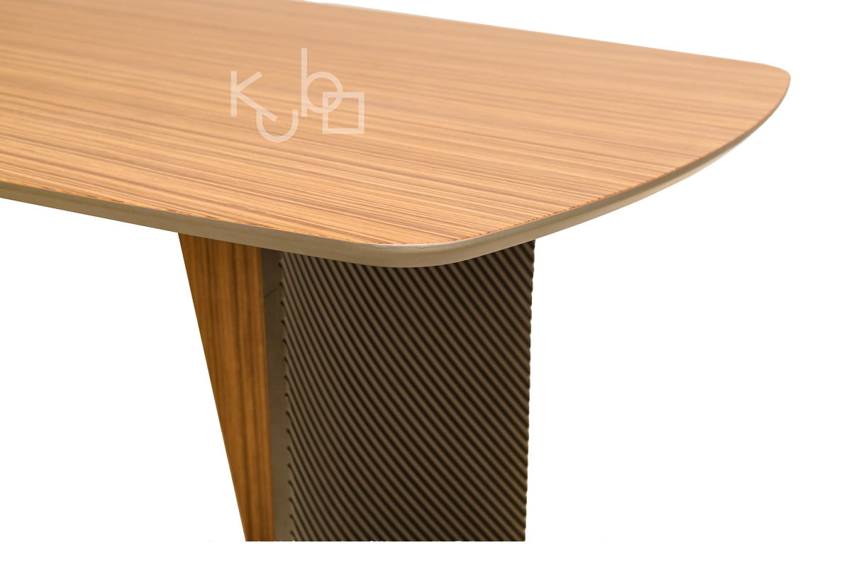 Τραπεζαρία καρυδιάς με καπάκι ροντέ στις γωνίες και ιδιαίτερη βάση αποτελούμενη από πόδια καρυδιάς επενδεδυμένα από κουρμπαριστά κομμάτια ξύλου με ραβδώσεις σε λάκα.