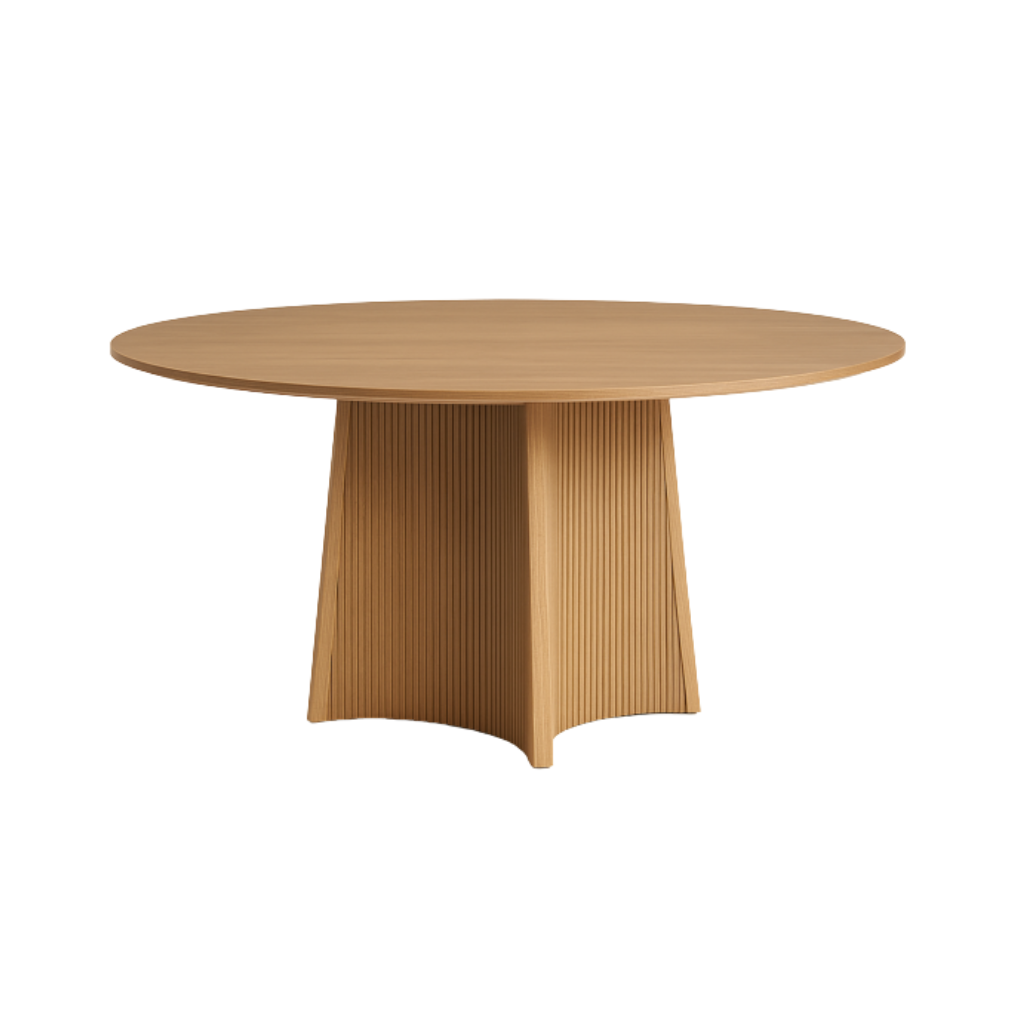 Η εντυπωσιακή βάση με κάθετες λεπτομέρειες από φυσικό ξύλο δημιουργεί ένα ιδιαίτερο παιχνίδι φωτός και σκιών, ενώ χαρίζει στο έπιπλο δυναμική και χαρακτήρα. Το κυλινδρικό σχήμα που ελαφρώς ανοίγει προς τα κάτω προσδίδει σταθερότητα και αισθητική ισορροπία, καθιστώντας το σημείο αναφοράς σε κάθε τραπεζαρία.