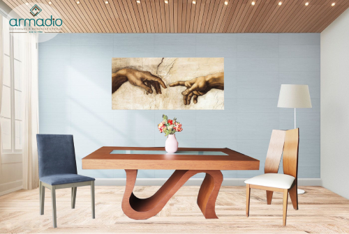 Μοντέρνα τραπεζαρία εξαιρετικής ποιότητας, κατασκευασμένο από ξύλο δρυς και με ιδιαίτερο σχεδιασμό στην βάση,  προσδίδοντας μοναδικότητα στο χώρο σας.