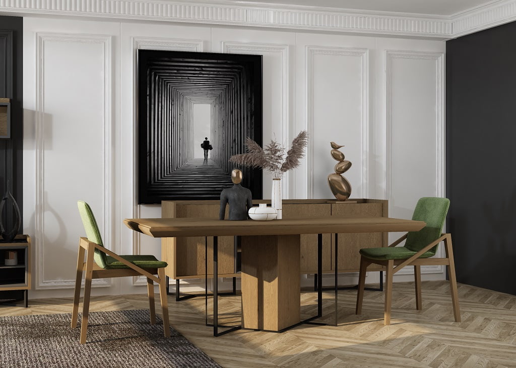 Ο φαρδύς ξύλινος πυλώνας σε συνδυασμό με τα μεταλλικά στηρίγματα κάνουν την τραπεζαρία
