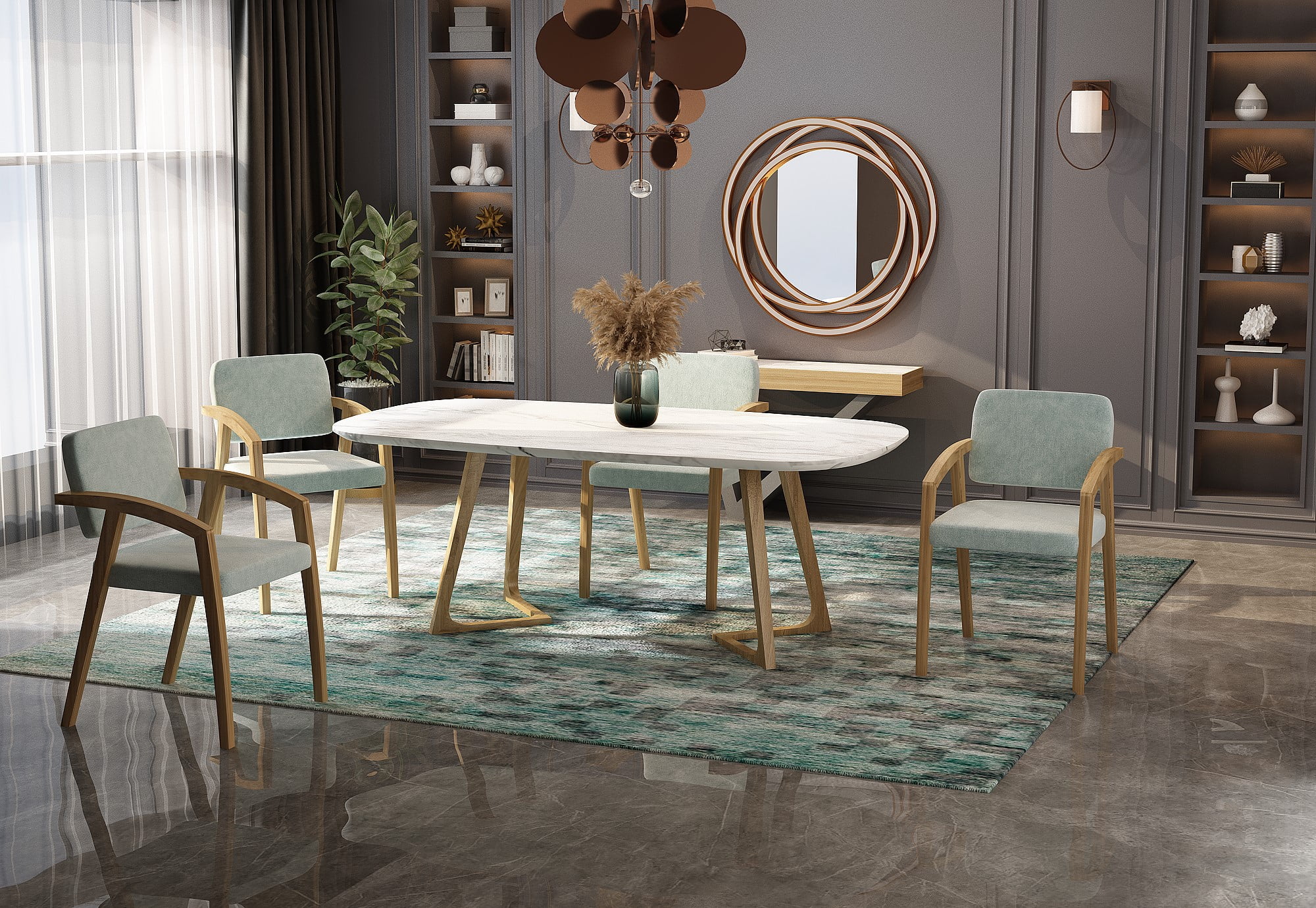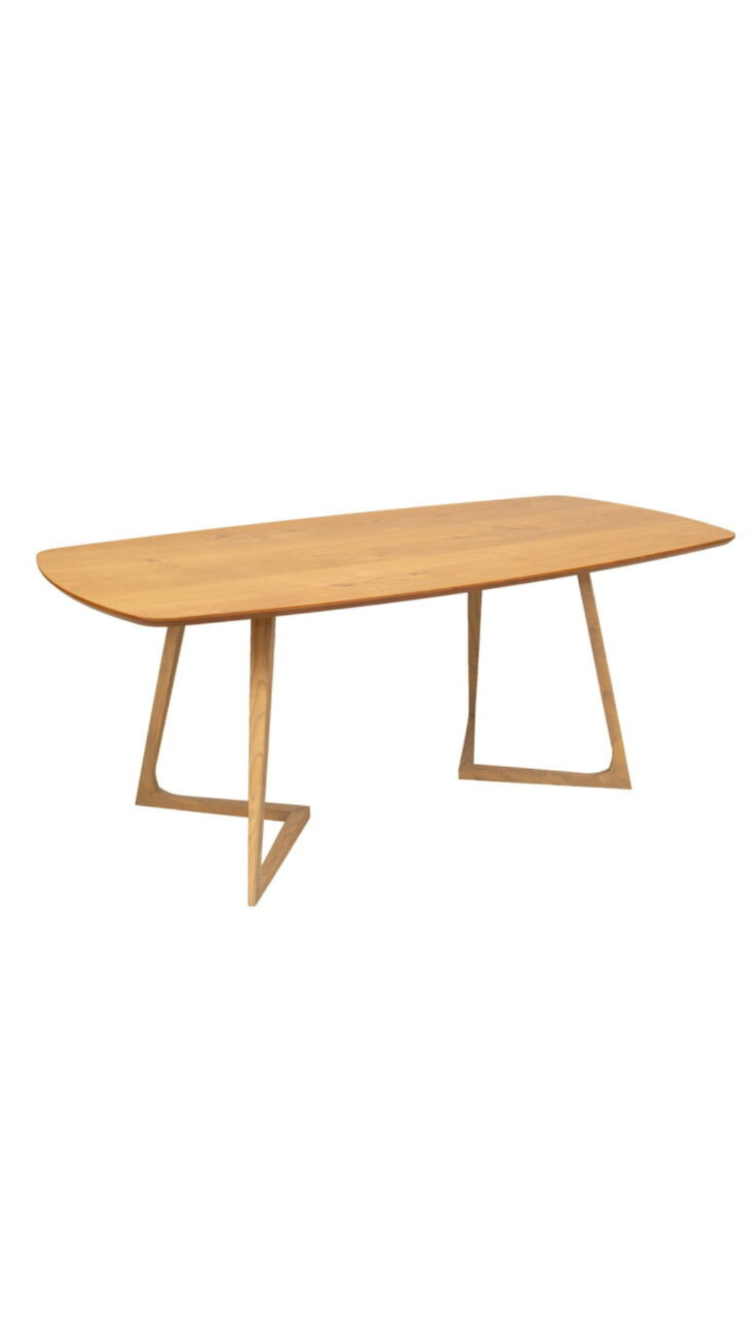 Τραπεζαρία από φυσικό καπλαμά δρυός με τριγωνικά τελειώματα στα πόδια της βάσης και εξαιρετικό κεραμικό καπάκι.