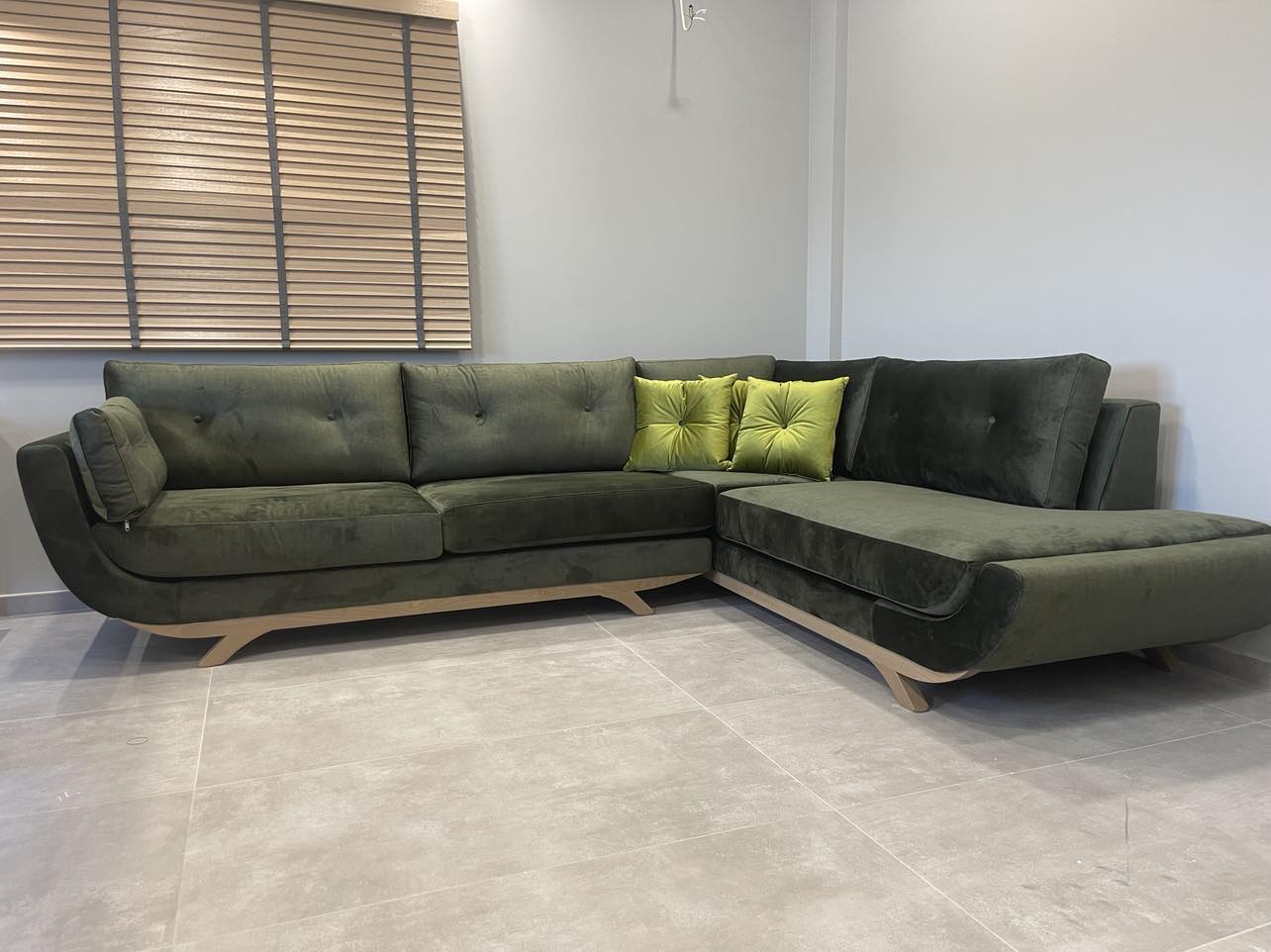 Γωνιακός καναπές Φένια με αδιάβροχο αλέκιαστο ύφασμα. Η ξύλινη μπάζα σε συνδυασμό με τα μπράτσα του σε σχήμα οβάλ είναι αυτό που το κάνει να ξεχωρίζει. Δυνατότητα κατασκευής 3θέσιο 2θέσιο κατόπιν τηλεφωνικής επικοινωνίας.