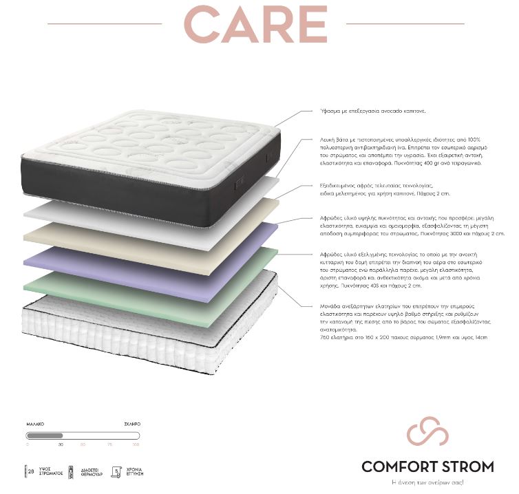 • Αφρώδες υλικό εξελιγμένης τεχνολογίας το οποίο με την ανοιχτή κυτταρική του δομή επιτρέπει την διαπνοή του αέρα στο εσωτερικό του στρώματος ενώ παράλληλα παρέχει μεγάλη ελαστικότητα, άριστη επαναφορά και ανθεκτικότητα ακόμα και μετά από χρόνια χρήσης.