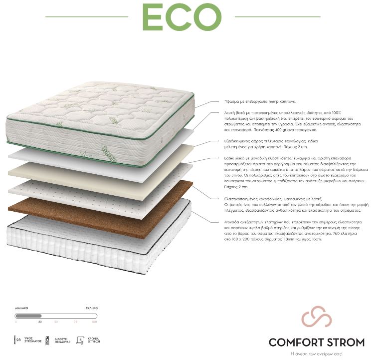 - Latex υλικό με μοναδική ελαστικότητα, ευκαμψία και άριστη επαναφορά προσαρμόζεται άριστα στο περίγραμμα του σώματος διασφαλίζοντας την κατανομή της πίεσης που ασκείται από το βάρος του σώματος κατά την διάρκεια του ύπνου. Οι πολυάριθμες οπές του επιτρέπουν στο σωστό εξαερισμό του εσωτερικού του στρώματος εμποδίζοντας την ανάπτυξη μικροβίων και ακάρεων.
