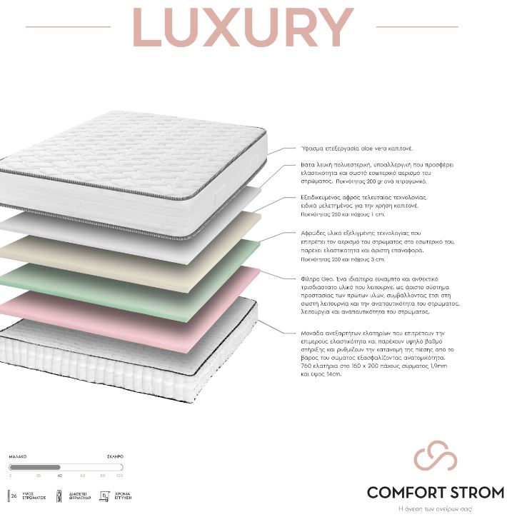 - Αφρώδες υλικό εξελιγμένης τεχνολογίας που επιτρέπει τον αερισμό του στρώματος στο εσωτερικό του, παρέχει ελαστικότητα και άριστη επαναφορά.