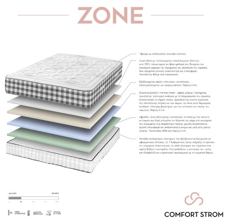 - Μονάδα ανεξαρτήτων ελατηρίων που φιλοξενούνται ξεχωριστά σε υφασμάτινους θύλακες. Οι 7 διαφορετικές ζώνες στήριξης επιτρέπουν την επιμερούς ελαστικότητα τουκάθε ελατηρίου και παρέχουν ένα υψηλό βαθμό υποστήριξης. Έτσι ρυθμίζεται η κατανομή της πίεσης και εξασφαλίζεται η εργονομική προσαρμογή με το σωματικό βάρος.
