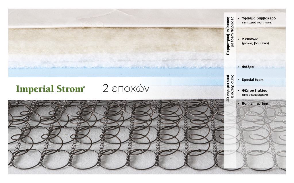 Τα ελατήρια του στρώματος 2 εποχών είναι ατσάλινα και συνδεδεμένα, τα λεγόμενα ελατήρια bonnell. Η μεγάλη τους πυκνότητα συμβάλλει στην σωστή στήριξη του σώματος και στην εύκολη περιστροφή του στρώματος. Έχει τις κατάλληλες ζώνες σκληρότητας και περιμετρική ενίσχυση με foam πορώδες για να επιτυγχάνεται η διατήρηση της φόρμας του. Η στρώση του με φίλτρο Ιταλίας αποστειρωμένο είναι και ο λόγος που το στρώμα σας είναι απαλαγμένο από μύκητες και άκαρι, ενώ τα υλικά του παραμένουν ανθεκτικά σε τριβές και φθορές. Εάν ψάχνετε ένα στρώμα με μεγάλη αντοχή στην πίεση που να σας διευκολύνει στον ύπνο, τότε το στρώμα 2 εποχών είναι ιδανικό.