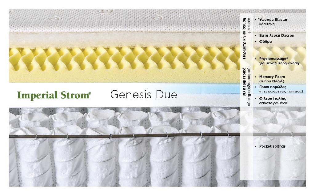 Το Genesis Due υπόσχεται μεγαλύτερες ανέσεις χάρη στον ενισχυμένο τάπητα ή αλλιώς τον πορώδες αφρό αλλά και τον αφρό μνήμης (memory foam), ο οποίος χαρίζει ακόμη περισσότερες ευκολίες ως προς την ανατομία. Η λευκή βάτα Dacron αγκαλιάζει υπέροχα το σώμα σας, ενώ το σύστημα Physiomassage έρχεται για να αλλάξει ό,τι πιστεύατε μέχρι τώρα για τα στρώματα. Η εξελιγμένη τεχνολογία του συστήματος προσφέρει περισσότερες ανέσεις, καθώς αυτό ακολουθεί τις καλύτερες μεθόδους χαλάρωσης και αντιστέκεται σε κάθε μυϊκό πόνο. Για την αποφυγή μικροβίων, το στρώμα Genesis Due διαθέτει το 3D περιμετρικό σύστημα εξαερισμού.