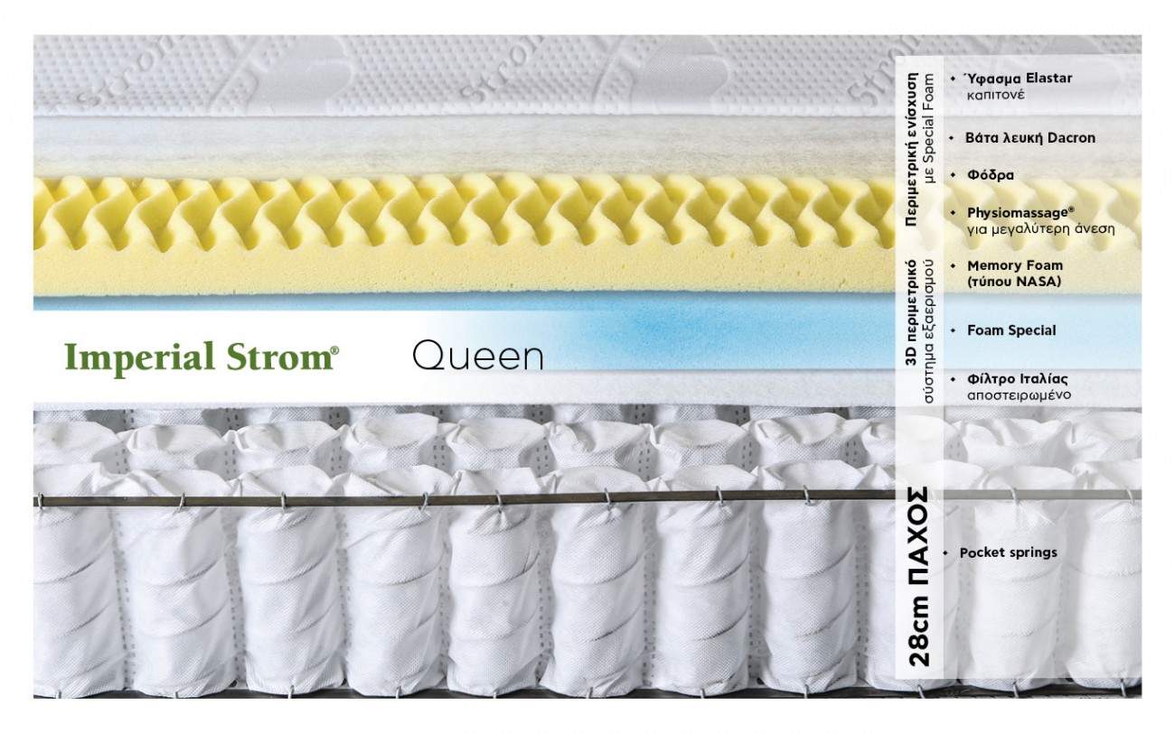 Το ανατομικό στρώμα της εταιρείας Imperial Strom είναι μέτριας σκληρότητας και διαθέτει ανεξάρτητα ελατήρια κλειστού τύπου (Pocket Springs) τα οποία δεν είναι ενωμένα μεταξύ τους, μέσα σε υφασμάτινες θήκες.